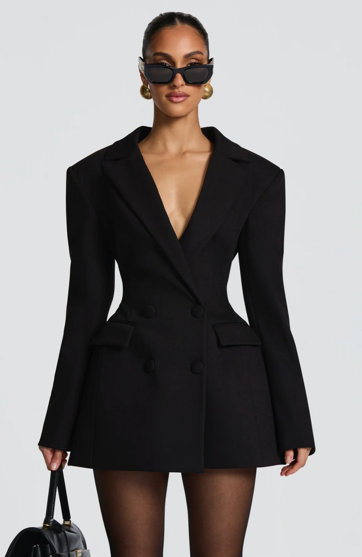 Boss babe in black features a tailored silhouette crafted from non-stretch woven suiting fabric. Its double-breasted design, notched lapel collar, and structured shoulder pads create a refined, cinched-waist look perfect for sophisticated occasions.
