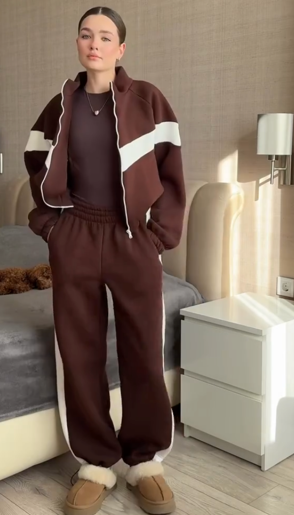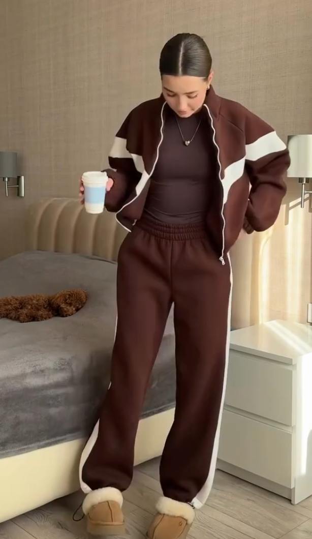 Striped Coffee Fleece Cropped oversized hoodie Co-ord Set.