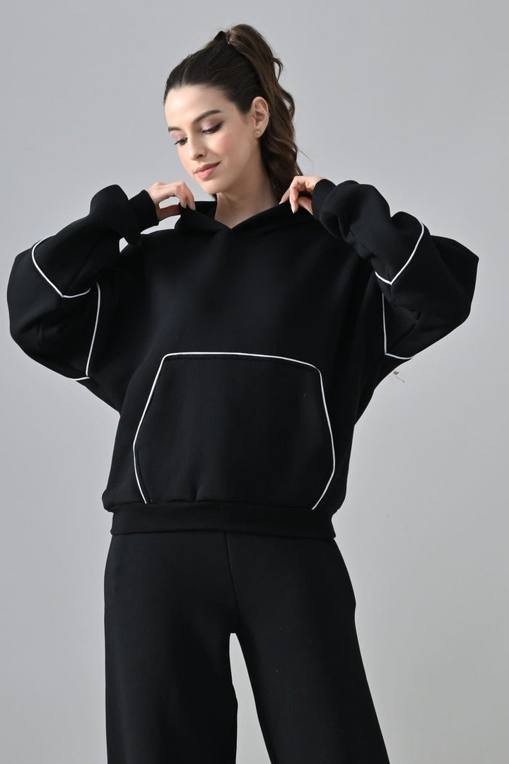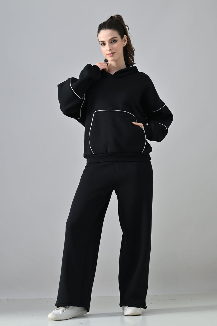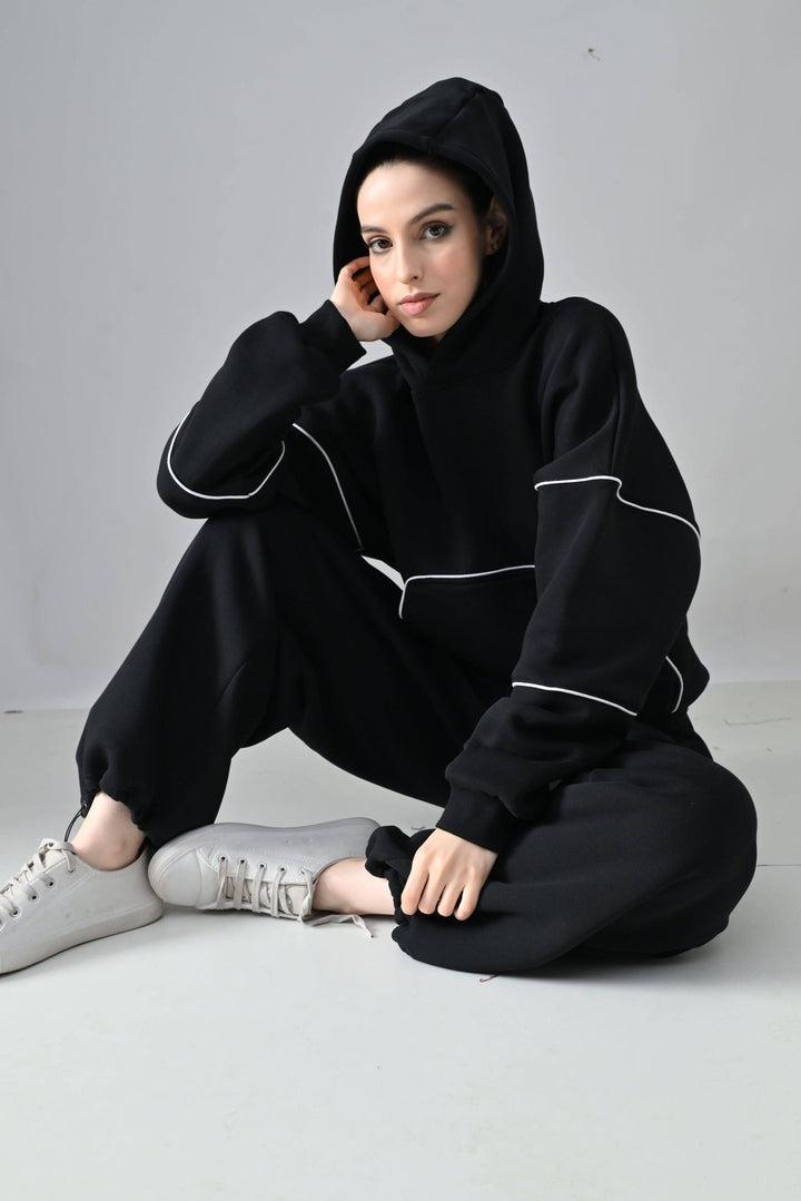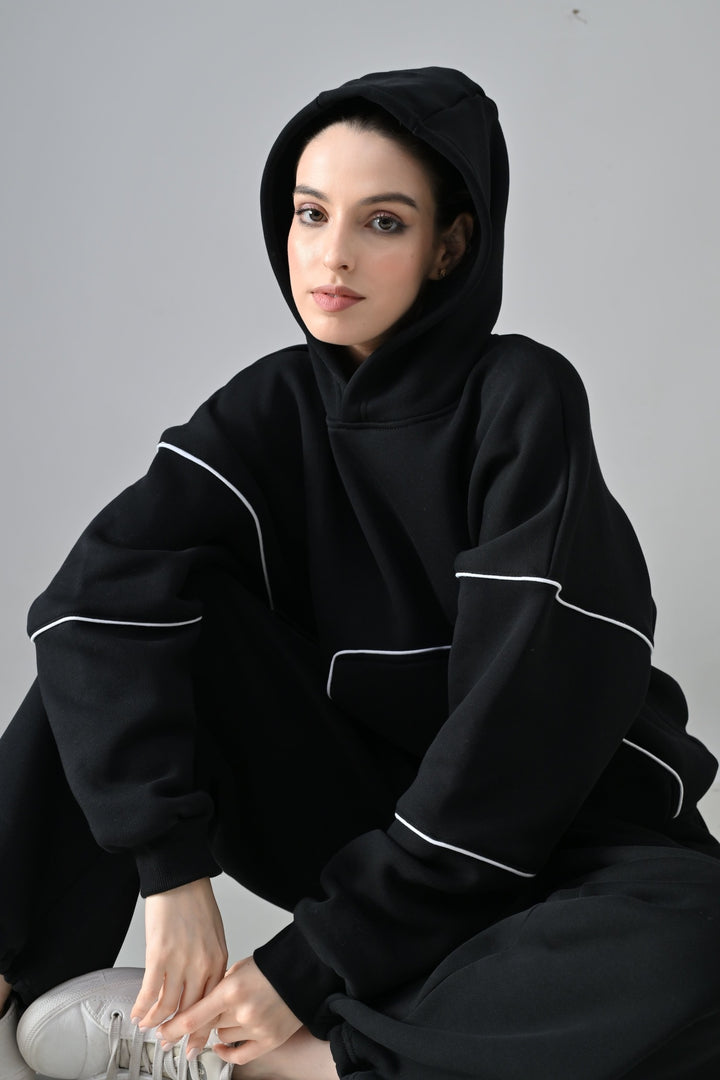 Piping detailed Black Fleece oversized hoodie Co-ord Set.