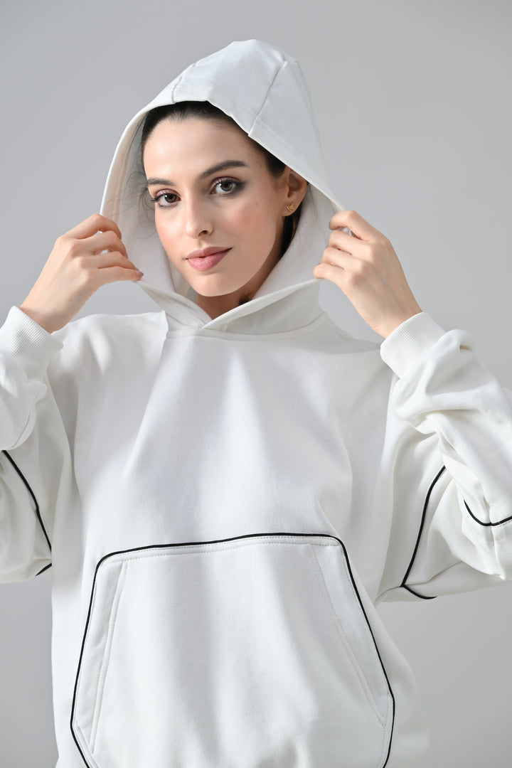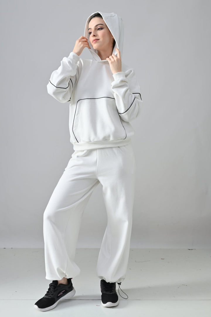 Piping detailed White Fleece oversized hoodie Co-ord Set.
